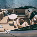 На карме катера находится удобная и просторная площадка для загорания в солнечную погоду, с выходом в море для купания, небольшой столик на несколько персон, два бежевых дивана и кресло. Также на борту судна расположены две зоны отдыха, встроенные в переднюю и заднюю часть, отсеки для хранения вещей, кулеры с прохладной водой для прогулки в жаркую погоду. Катер оснащен индивидуальной водопроводной системой и санузлом.