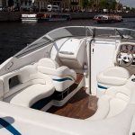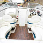 Интерьер комфортабельного судна оформлен в классических светлых тонах. В вашем распоряжении будут мягкие диваны из натурального дерева и кожи, тент от дождя, отдельный санузел для гостей.