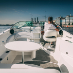 На палубе – мягкие белоснежные сидения. В носовой части судна – удобные диваны. Здесь открывается панорамный вид на реку, каналы, залив и берега. На катере работает система подогрева, поэтому прогулка будет комфортной, даже если аренда запланирована в прохладную погоду. От дождя предусмотрен тент. Наслаждаться красотами Северной столицы можно под музыкальное сопровождение, а если желаете больше узнать о достопримечательностях города на Неве, к вашим услугам – профессиональные гиды.
