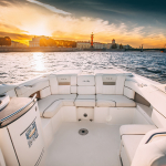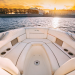 Салон лодки имеет высокие потолки, достаточно вместителен, мебель выполнена в натуральной коже приятных карамельных оттенков. Кухонная зона оснащена всем необходимым для приготовления и хранения еды. Кроме того на катере имеется туалет. Удобная посадочная платформа избавит вас от дискомфорта при посадке и высадке с борта. Для еще более приятного времяпрепровождения на борту предусмотрена аудиосистема, на которой вы сможете поставить свою любимую музыку. На палубе есть матрас для отдыха и принятия солнечных ванн. Ну а если вы немного замерзнете, всегда можно согреться, завернувшись в уютный плед.