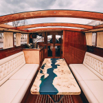 Даже прогулки на высокой скорости проходят с комфортом и приятными ощущениями. При длительном переходе наблюдение за красотами окрестностей происходит на уютных мягких диванах. Встроенная панорамная крыша водного лимузина защитит в нужный момент от плохих погодных условий и палящих солнечных лучей. Есть возможность порадовать себя и гостей свежеприготовленным чаем или кофе в сопровождении любой музыки. На борту катера можно удобно расположиться для принятия солнечных ванн или танцевать в небольшой компании во время остановки в глубине акватории.
