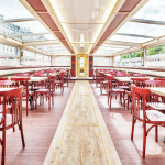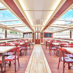 Комфортабельный теплоход оборудован современной мебелью в классическом английском стиле. В крытом салоне находится удобная мебель из натурального дерева с отделкой из дорогих материалов. Благодаря светящемуся панорамному потолку, судно нередко выбирают для проведения торжественных событий.