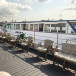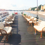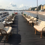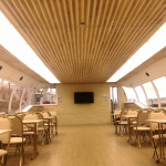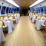 Благодаря панорамному остеклению ваши гости смогут полноценно наслаждаться видами Петербурга, не покидая закрытую палубу. Кроме того такое остекление наполняет палубу светом и делает ее просторнее. Интерьер выполнен в светлых оттенках бежевого, что также визуально расширяет пространство.