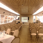 Спешим сообщить, что теперь в нашем флоте появился и доступен для аренды стильный, современный и привлекающий внимание двухпалубный теплоход «Мрия». Теплоход спущен на воду только в 2017 году. Это судно прекрасно подходит для аренды под крупные торжественные, деловые и увеселительные мероприятия. Свадьбы, дни рождения, юбилеи, разнообразные корпоративные мероприятия – любое торжество пройдет здесь по высшему разряду. Вместимость судна при банкетной рассадке гостей составляет 100 человек, а при фуршетном накрытии достигает 110 человек. При этом вы можете быть уверены, что гости будут свободно перемещаться по судну, не мешая друг другу, а при желании обязательно найдут себе удобное кресло или диван, чтобы присесть.