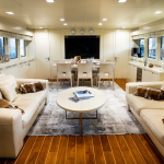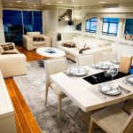 На борту роскошной яхты есть четыре комфортабельные каюты, оборудованные мягкой мебелью. В двухместных номерах есть все необходимое для прекрассного отдыха пассажиров: просторные кровати, тумбочки, шкафы и прочее.