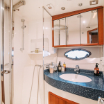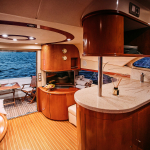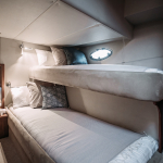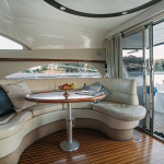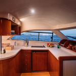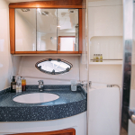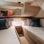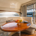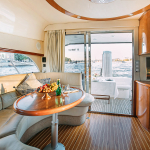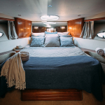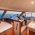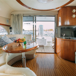 На судне имеются: 3 каюты (мастер, дабл, твин), 2 эргономичных санузла, оборудованная кухня (холодильник, морозильная камера, плита, СВЧ) просторный флайбридж, обеденная зона в салоне и на кокпите, телевизор, электроэнергия, пледы, посуда, чай, кофе, музыка и тент.