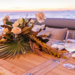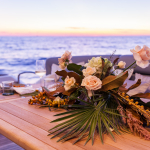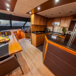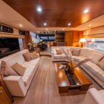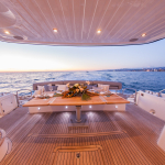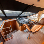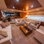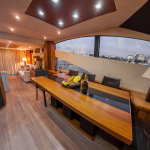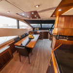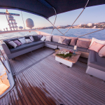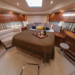 Помимо 3-х гостевых кают, в салоне шикарной яхты есть удобные мягкие диваны и столы для отдыха и праздничного банкета. Во время путешествия можно расположиться вместе с друзьями на флайбридже, где оборудована обеденная зона.